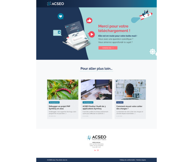 La Thank You Page est la page sur laquelle le visiteur atterrit après avoir effectué une action (sur une LP Lead Magnet, une LP SEA…) : elle permet de le remercier, de confirmer son action, et de le rassurer sur les prochaines étapes à venir.