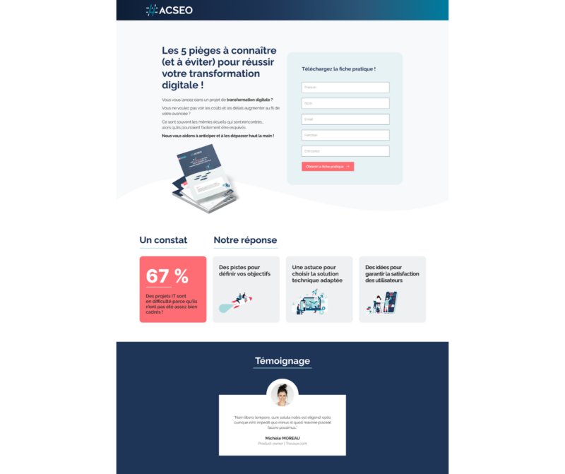 - Contenu de haute valeur : face à la saturation de contenus, misez sur l’ultra-spécifique avec votre landing page B2B. Utilisez le vocabulaire métier précis de votre cible et intégrez des retours d’expérience parlants.
