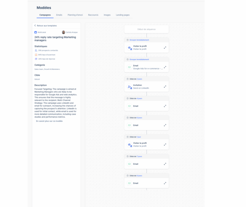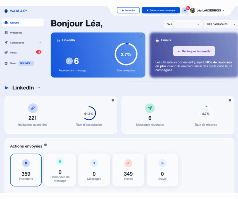 Connu pour la séquence automatisée sur LinkedIn , Waalaxy s’est récemment lancé dans l’emailing. C’est la plateforme de prédilection pour déployer vos séquences sur le réseau pro.