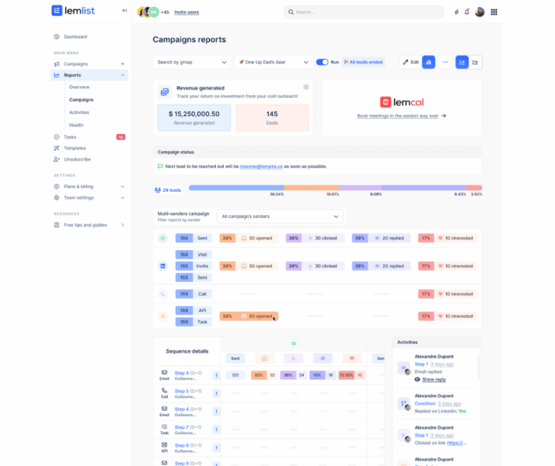 Lemlist se démarque par son haut niveau de personnalisation (emails avec images dynamiques, contenus IA, vidéos, etc.) et son écosystème complet pour vos campagnes. L’outil centralise toute la stratégie outbound :