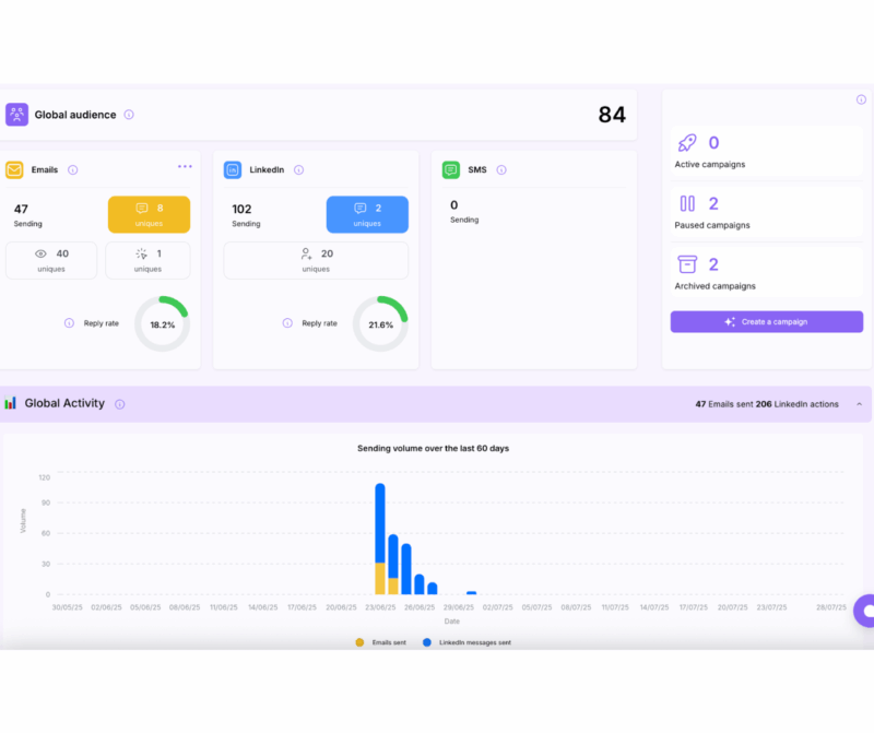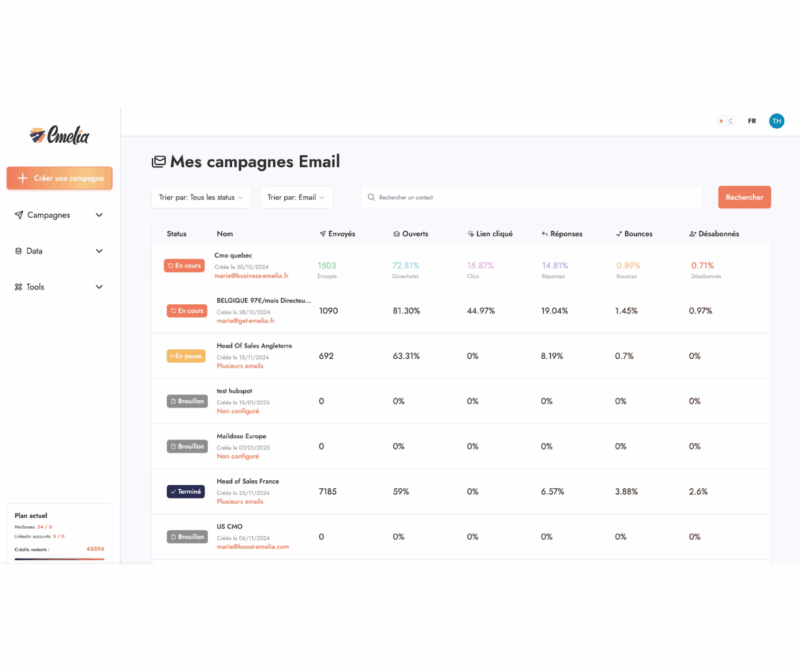 Emelia s’est fait connaître par sa capacité à gérer des séquences d’emailing à fort volume , et récemment a commencé à développer des fonctionnalités multicanales. L’interface offre l’essentiel pour débuter.