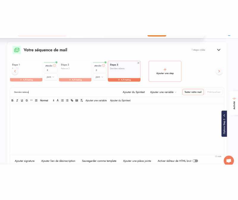 L’outil a récemment intégré la possibilité de créer des campagnes liant LinkedIn et email sur le même workflow. La plateforme propose un warm up (à lancer 15 jours avant), ainsi que l’ajout de tâches manuelles et l’envoi de messages via Whatsapp. Côté copywriting , Emelia a un feature Spintext pour faire varier des éléments d’un email (introductions, salutations) et ainsi réduire le risque de spam. Un test d’email reste possible pour vérifier la délivrabilité.