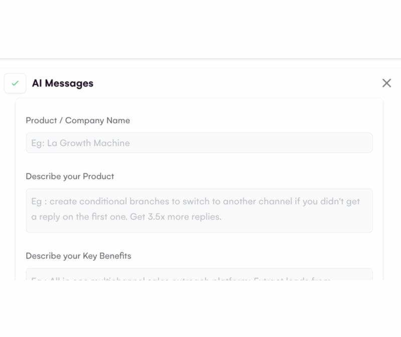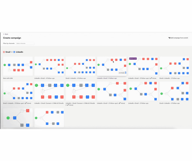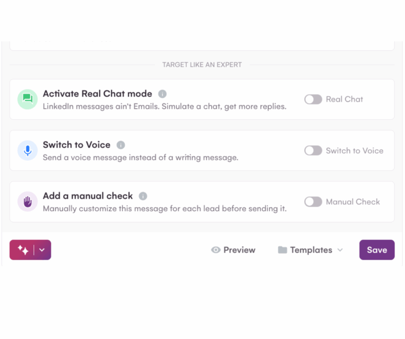 La force de LGM réside dans sa facilité de prise en main . L’interface est fluide et la bibliothèque de templates est assez complète. À noter que l’option pour créer une séquence sans template est disponible uniquement avec le plan Ultime. L’ IA est désormais présente lors de la rédaction des messages, pour les A/B testing, et pour les messages vocaux personnalisés. Leur dernière nouveauté, le “Real chat mode” , permet d’envoyer des messages en plusieurs fois, comme si vous le tapiez vous-même.