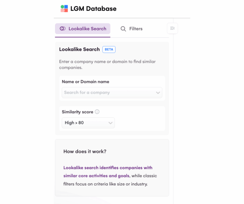 - la recherche “Lookalike” : il faut entrer le nom d’une entreprise idéale et choisir le niveau de similarité (70 % à 85 %) – une fonctionnalité encore beta ;