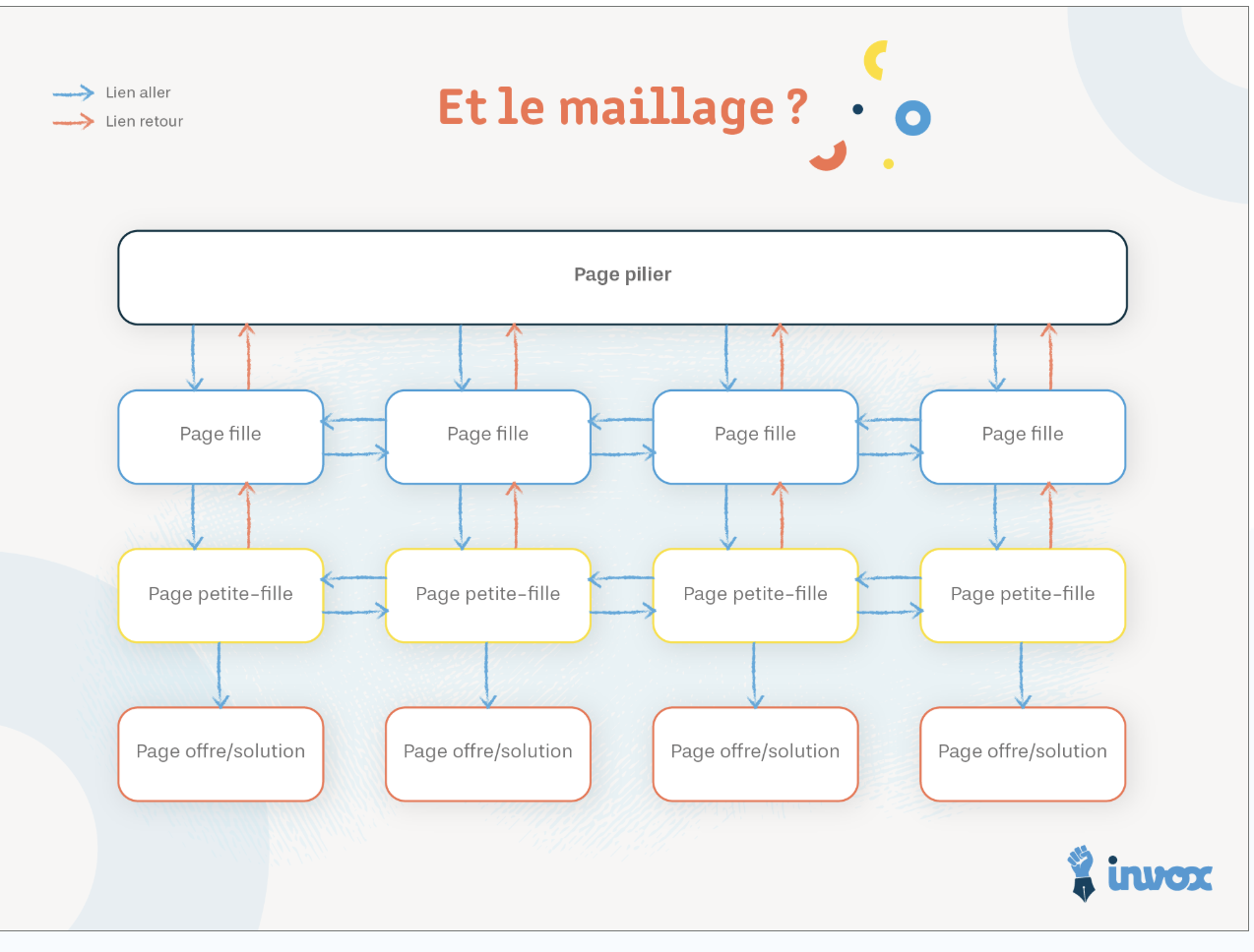 Les pages, qu’on appelle pages filles ou pages petites-filles en fonction de leur niveau de profondeur, sont reliées entre elles ainsi qu’à la page pilier grâce à des liens internes : c’est le fameux maillage interne. Ainsi, tous ces liens présents sur votre site forment des cocons sémantiques, qui doivent contribuer à la cohérence globale du site, et dont l’objectif est d’amener les utilisateurs jusqu’à vos pages offres ou services grâce à un jeu d’équilibre du jus SEO. Autrement dit, ils jouent sur sa structure et sur l’expérience que vous proposez aux internautes, tout en produisant une valeur ajoutée importante pour votre SEO.