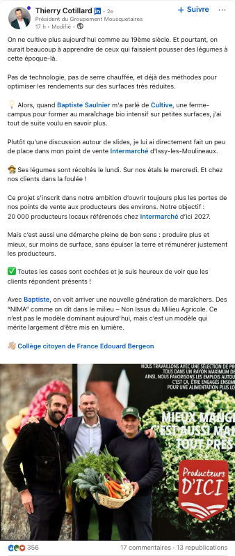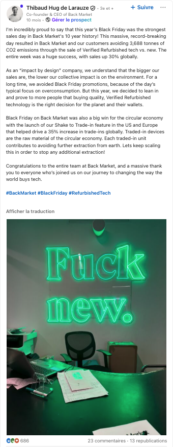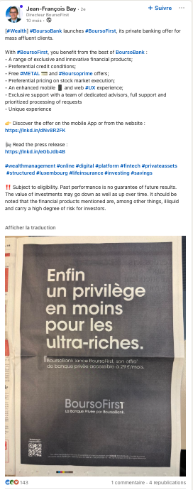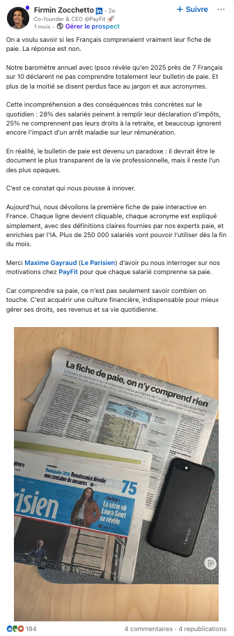 Les dirigeants ont tendance à fuir les publications commerciales : ils souhaitent sans doute incarner autre chose et laissent les équipes Sales se charger du Social Selling… Mais il y a certainement des angles à trouver pour soutenir l’effort business plus directement !
