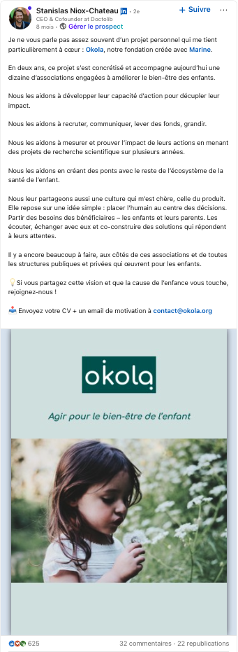 Ce n’est pourtant pas dérangeant de conserver une part de publications très personnelles sur LinkedIn. Il y a d’ailleurs de nombreux combats que l’on mène dans notre vie, des épreuves que l’on traverse, des actions ou causes que l’on soutient, qui pourraient faire l’objet d’une publication.